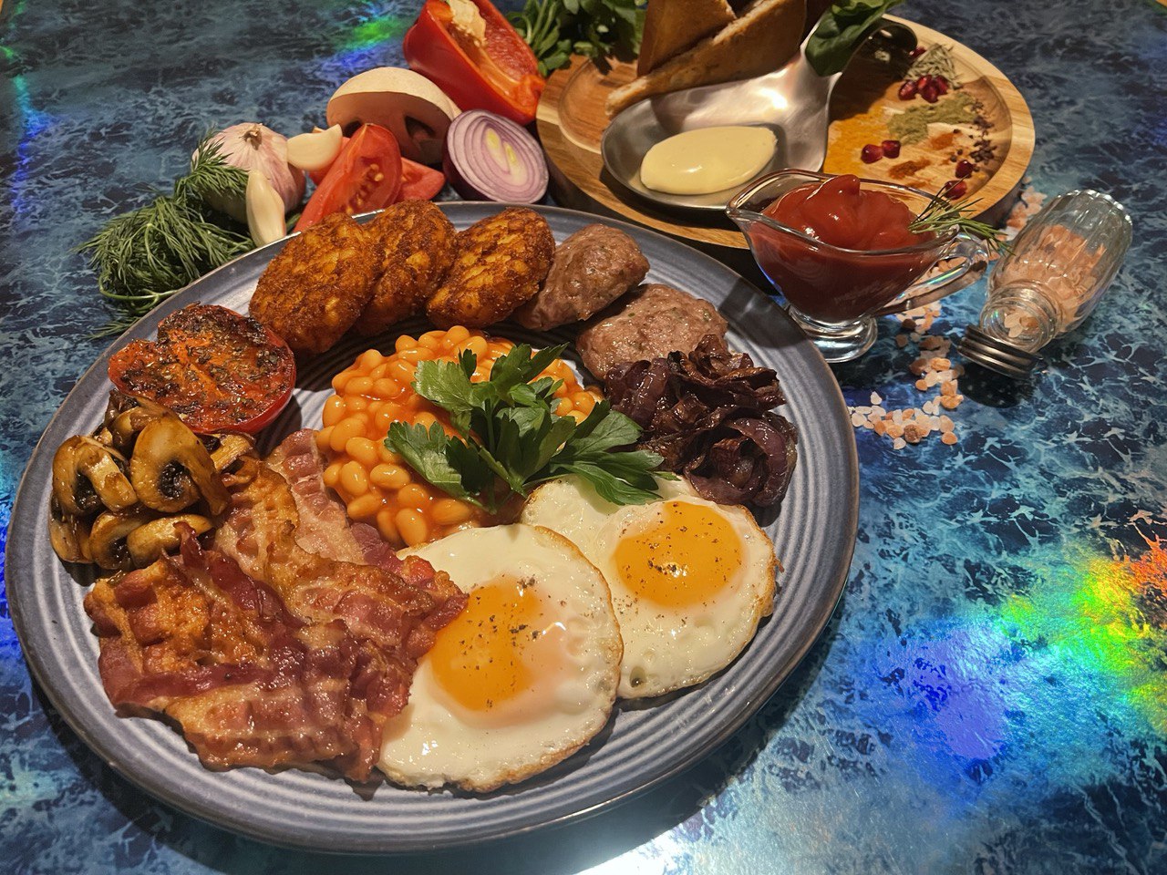 Gluten Free Full English Breakfast inspired by CheeSUS: Fried Eggs, Crispy Hash Browns, Handmade mini Cutlets, Smoked Streaky Bacon, Garlic Mushrooms, Fried Red Onion, Baked Herbed Tomato, Baked Beans, G/F Toast with Handmade Smoked Cheese Spread and Garnishes, Sauce for a Choice.
